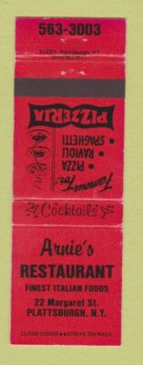 Matchbook Cover Arnie S Restaurant Italian Pizza Plattsburgh Ny Red Ebay